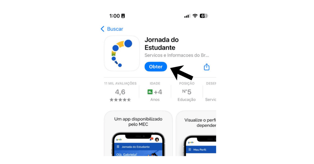 2️⃣ No campo de busca, digite: Jornada do Estudante. Toque no resultado cujo desenvolvedor é “Ministério da Educação (MEC)”.