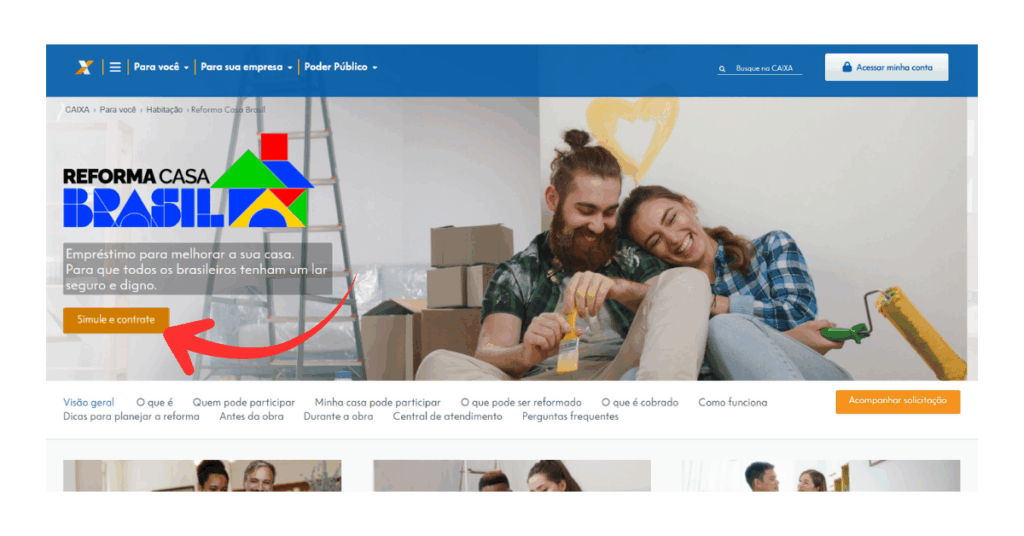 Acesse o site oficial da Caixa. Lá procure por Programa Reforma Casa Brasil e clique em “Simule e Contrate”.
