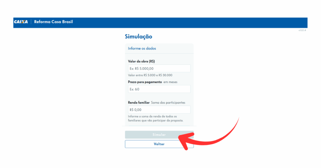 Coloque o valor da obra, o prazo para pagamento e a renda familiar. Clique em simular. O sistema mostrará o valor total a ser pago, juros e demais informações.