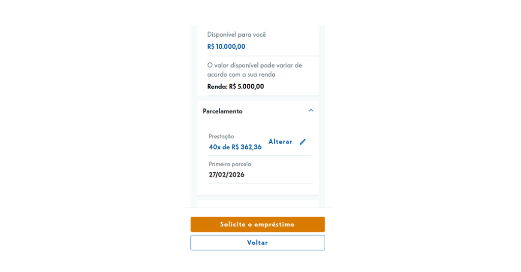 d) Caso não concorde com os valores, você poderá voltar e realizar quantos simulações quiser. Caso aceite, poderá prosseguir e solicitar o crédito.
